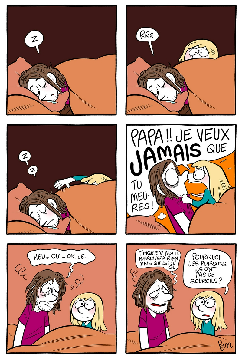 Brave petite 😊 Il est censé être quelle heure du matin, dans cette histoire ? Au moins 3 heures c'est ça ? 😂 Merci Laurel, toujours une chouette planche, dont j'aime bien la colorisation (simple mais efficace 😉) 🙂