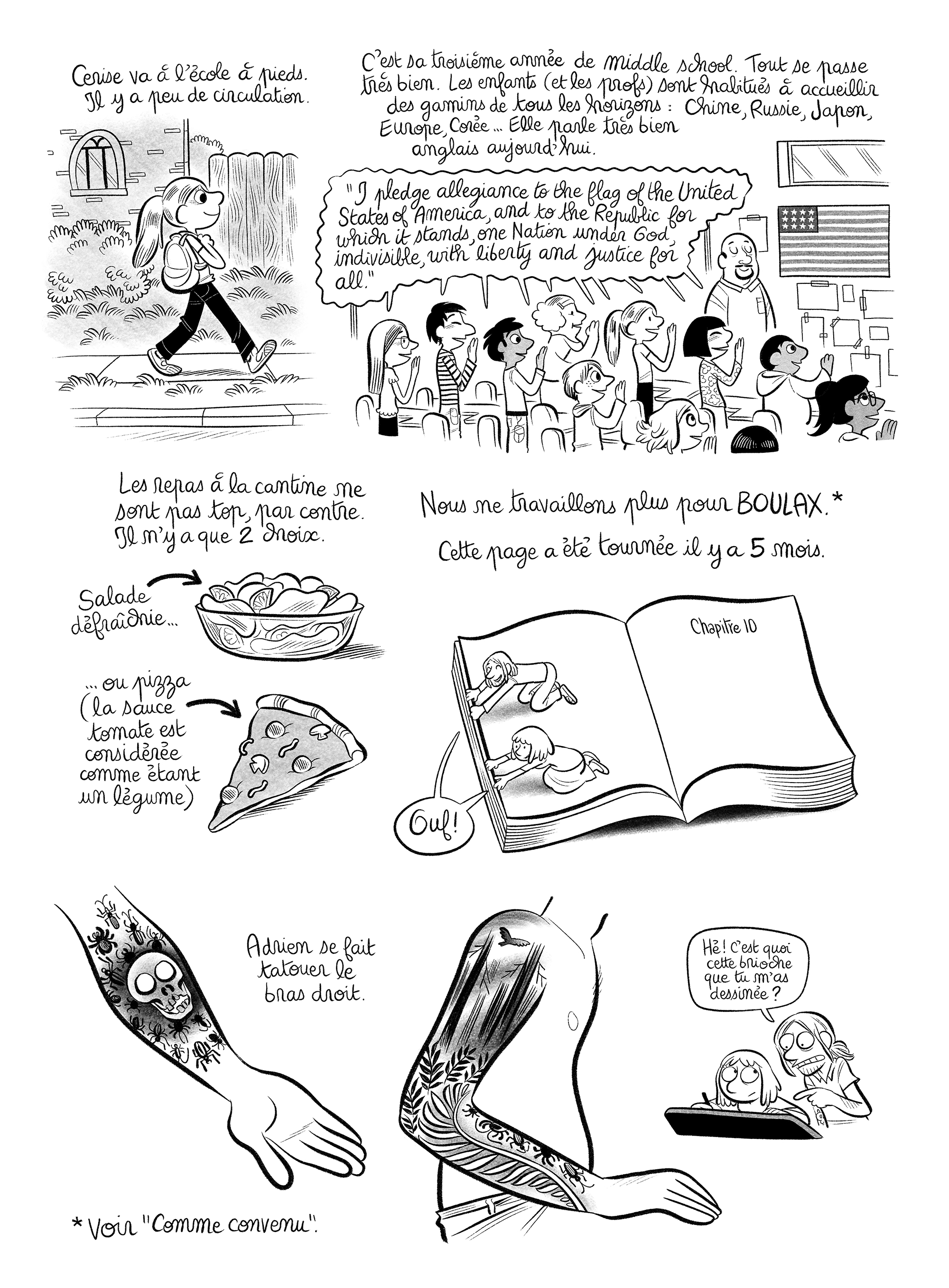 Je trouve le rythme un peu étrange en fait, on dirait que les choses sont racontées comme elles te viennent à l'esprit et ça me donne presque une impression de jounal intime. Et puis la mention de boulax me paraît un peu abrupte et (bon ça n'engage que moi) ça m'aurait bien plu une planche qui ne parle que de Cerise. Mais c'est toujours facile de critiquer, merci pour ton travail :)