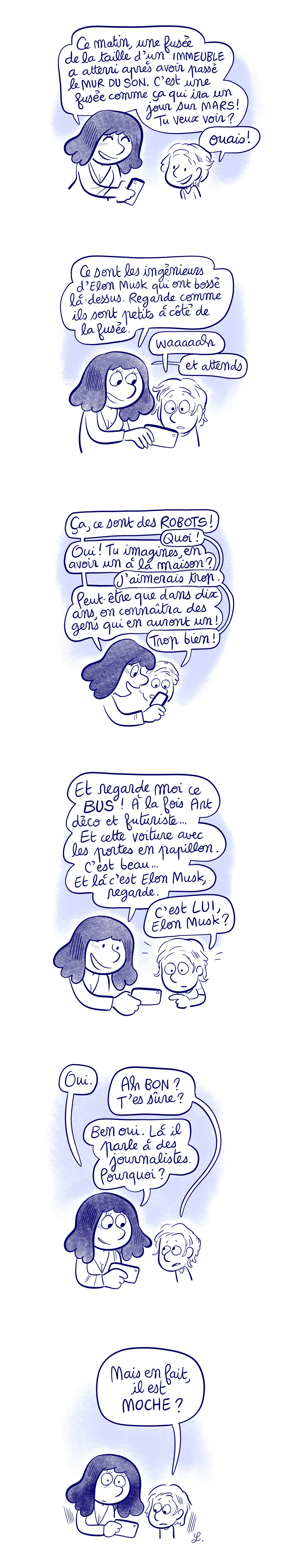 Musk a beau être un ingénieur brillant, c'est un facho de première et soutien inconditionnel de Trump (donc raciste, misogyne, incitation à la haine...), qui propage des fake news... Il dit des choses abominables. J'ai du mal à comprendre comment tu détournes les yeux de ça (ou que tu t'en fiches) et que tu sois juste en admiration devant les prouesses techniques. Ca me met hyper mal à l'aise, perso (surtout devant un enfant).
