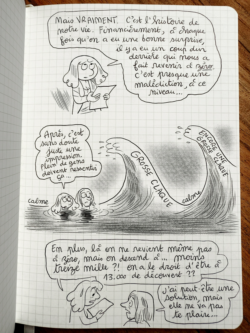 Ça ne répond pas à ma question : au moment de l’accident votre compte était déjà à zéro, non ? Ni Adrien, ni toi n’aviez de salaire, donc on peut en déduire que l’argent mis de côté pour les 8 mois était déjà envolé dans les premières semaines ? En tout cas c’est ce j’en comprends de tes dessins