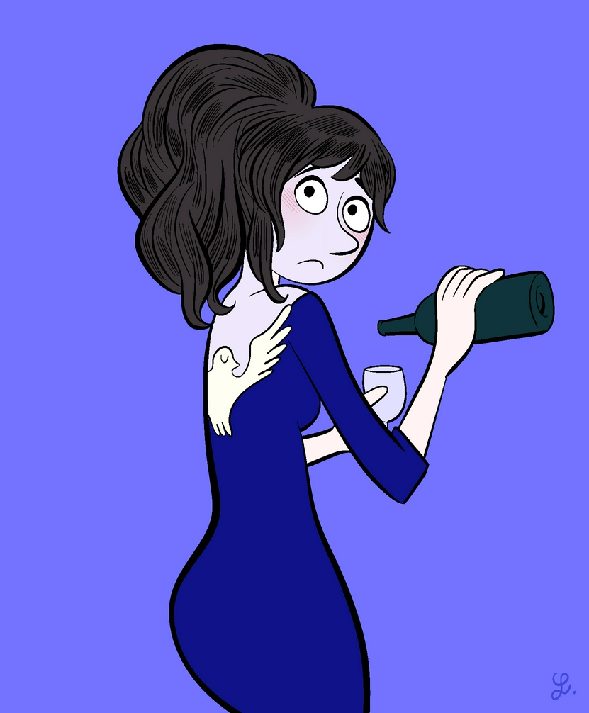 Quand j'ai vu ce dos, j'ai eu envie de me faire un haut pareil. Ensuite j'ai regardé le reste... Elle est triste, pique un fard... d'être vue ? Vue à se servir un verre ? Elle boit seule ? Je ne sais pas qui tu représentes, mais visiblement elle a besoin d'être aidée. J'ai beaucoup de compassion pour elle.