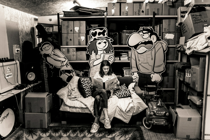 Et Cerise qui nous aide avec les cartons, et prend une pause lecture (Les cahiers d'Esther) dans l'espace qui nous sert de stockage et de salle de répète : 📦📦📦