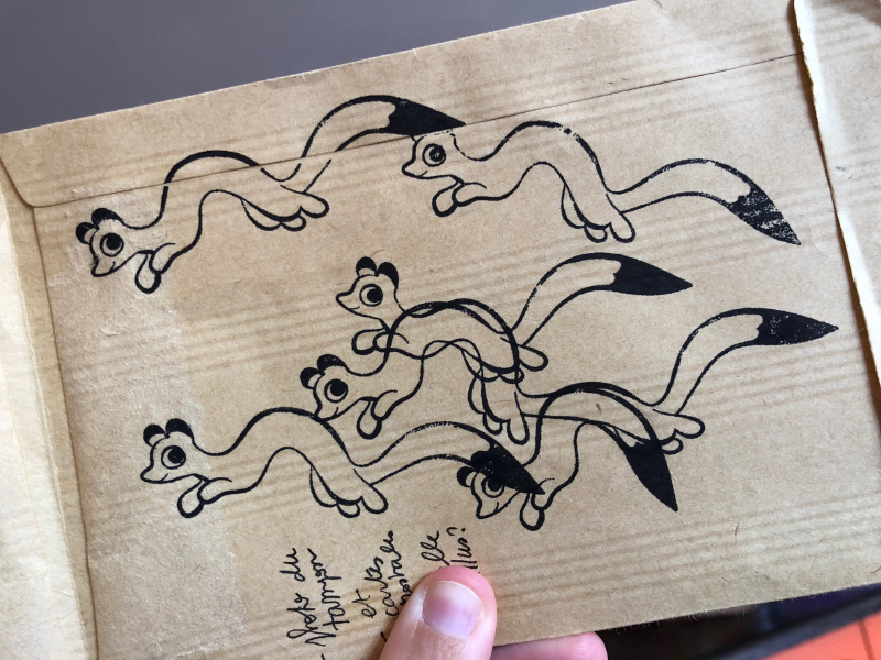 🙂 Et une photo du tampon que j'ai commandé pour décorer un peu les cartes postales, et les enveloppes qui protégeront le Tirage du mois