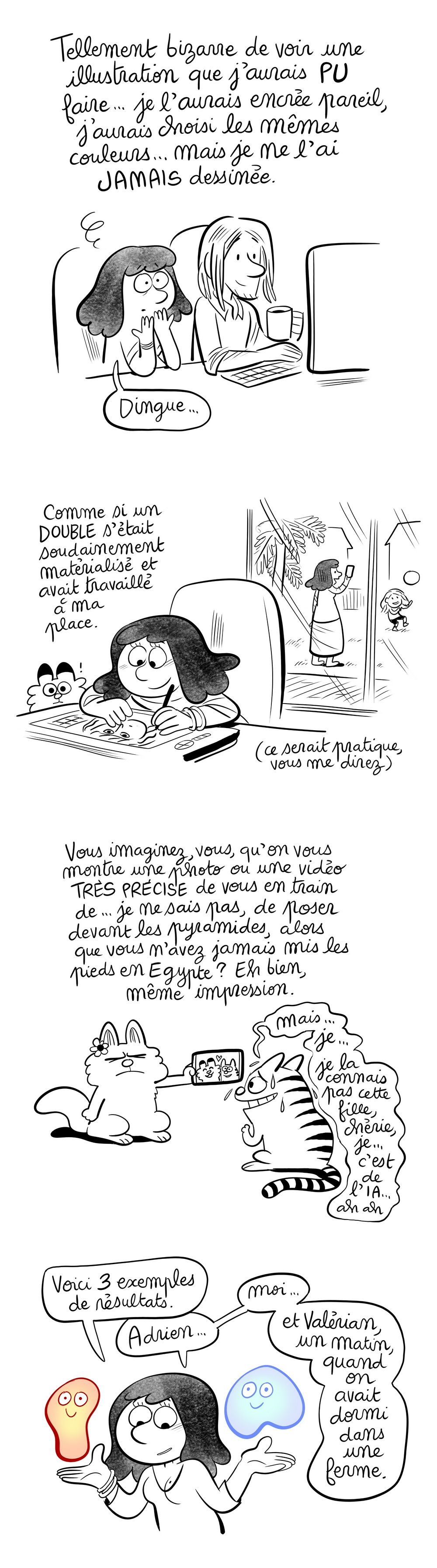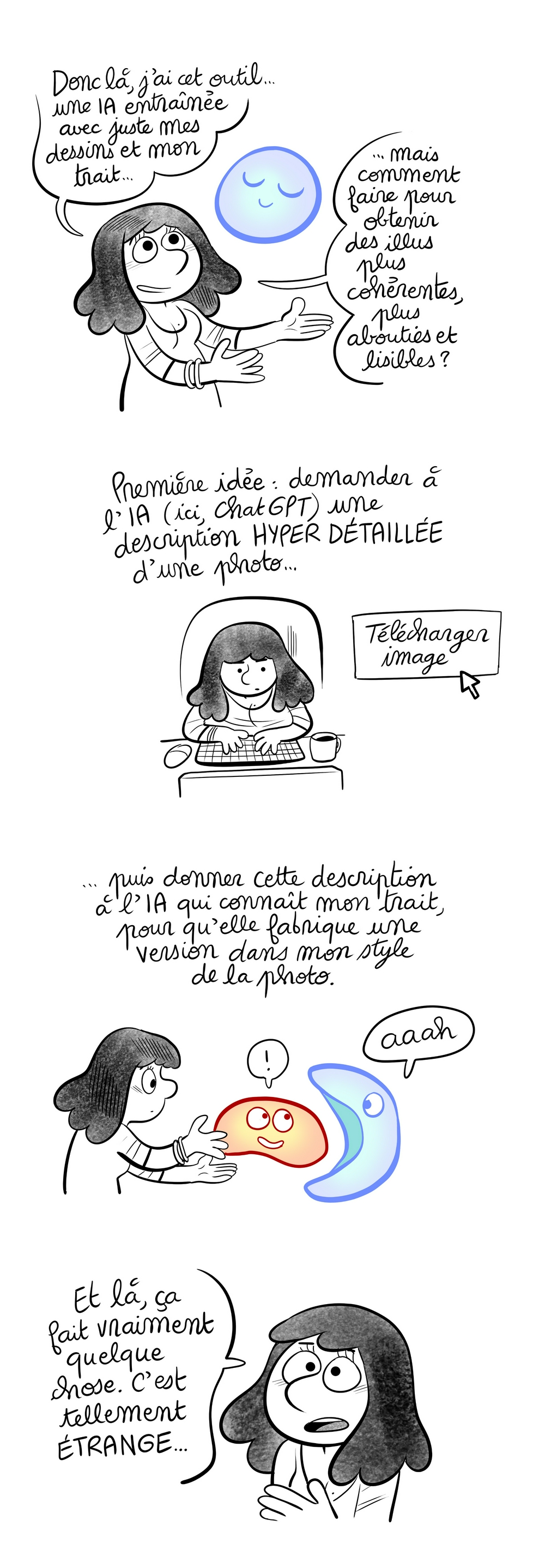 Je vais dissocier le dessin "plaisir", le blog, le dessin lors d'une balade, le contact du papier, du crayon, du dessin "boulot", essentiellement des commandes de clients (les BD c'est autre chose). Est-ce que dans le deuxième cas, l'IA permet de gagner du temps, de produire plus à certaines phases comme le début où différents projets sont proposés sans qu'une finition soit forcément exigée [je ne connais pas les phases par lesquelles il faut passer, je me fais un film :D ] ? Il a fallu un certain temps pour créer et exposer la description complète d'une photo sur chatGPT mais est-ce qu'il a fallu plus ou moins de temps que de le faire "à la main" ? Pour moi l'IA doit servir à faire faire des tâches peu gratifiantes et donc laisser plus de place à d'autres tâches. Une fois cela dit sur l'aspect technique, on ne parle pas de l'aspect légal et de la protection des données. Le gros écueil de l'IA va être celui-là. Faut-il payer Laurel pour un dessin "à la manière de Laurel" ?