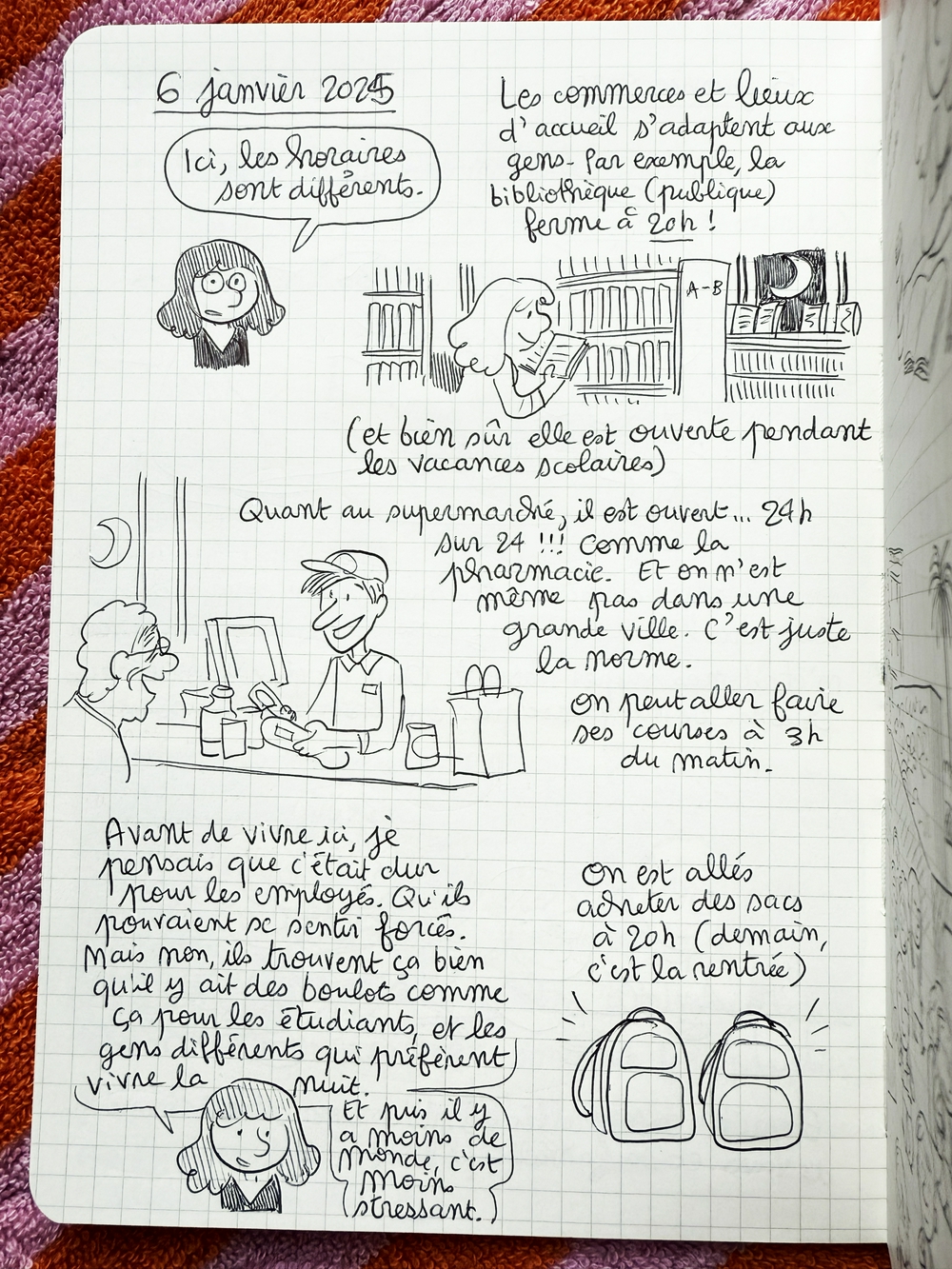 La bibliothèque publique qui ferme à 20h, c'est chouette car certains adultes travaillent tard, etc. Mais les supermarchés ouverts 24h/24 et l' "idéal" de consommation à toute heure du jour et de la nuit qui va avec, ça me rebute pas mal.