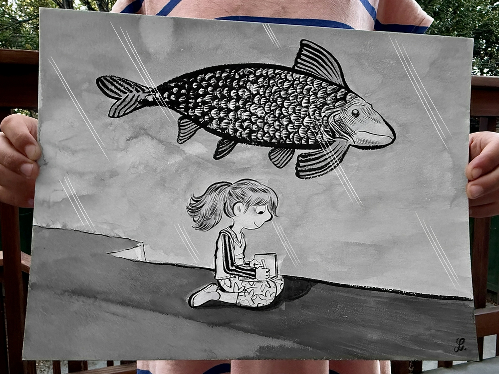 Désolée mais je n'ai pas regardé le nom du poisson ! 😳C'est au Pentel. Et de l'encre de Chine + eau pour le fond... Mais je n'aime pas trop. Je l'ai refait, je le posterai demain quand je l'aurai pris en photo... 😊