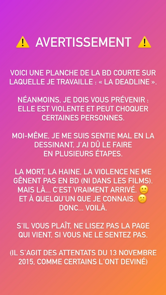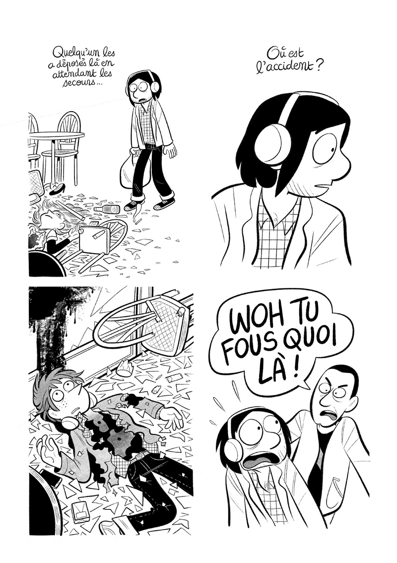 A mon avis le jeune homme est sous le choc et essaie de donner un sens "normal" à ce qu'il voit, ce que rend très bien le traitement de Laurel. Pour l'absence d'hémoglobine, c'est peut-être que les plaies ne saignent pas encore, cela vient d'arriver. Les images sont choquantes, en ce sens que les jeunes gens semblent des poupées cassées, on a brutalement volé leur vie. J'aurais aimé qu'il se trouve quelqu'un pour dessiner l'attaque contre une école juive de Toulouse, le 19 mars 2012 : un enseignant, ses deux jeunes fils et une petite fille tués à bout portant, comme des chiens. L'indifférence publique à cet attentat a ouvert la voie aux attaques qui frappent désormais tout le monde sans distinction, dans les villes occidentales.