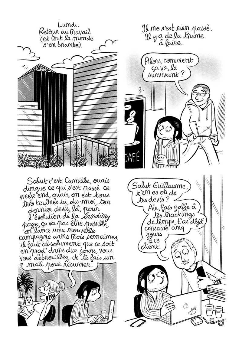 Je me suis fait les mêmes remarques. J'ai été surprise dans cette page de revenir au lundi matin suivant. Ou alors c'est celui d'après et ils parlent d'autre chose que des attentats : des manifestations de soutien ? des enterrements ? Ils ont enterré quelqu'un de la boite ? On en a parlé dans les premières pages peut-être...
