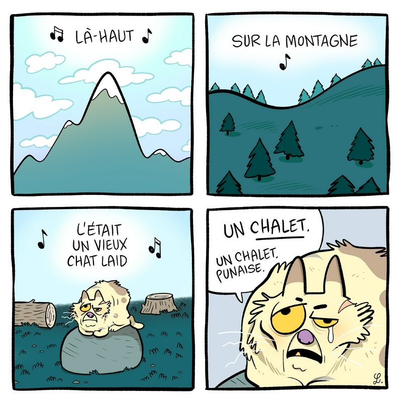 tiens, une petite variation sur le couplet : "poil blanc, vraiment pas beau, haleine de tartre, un peu crado... Là hauuuuuuuuut sur la montaaaaagneu, l'était un vieux chat laid..."