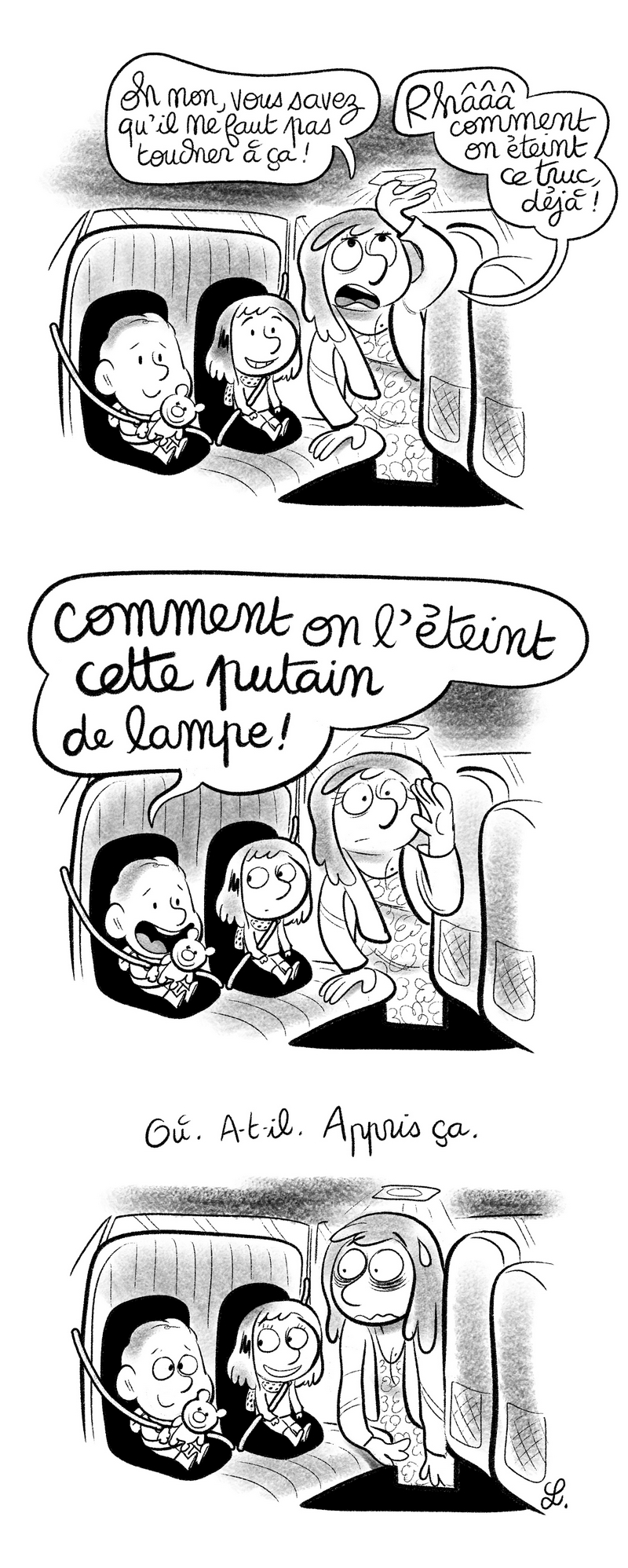 Le lendemain, dans notre petite ville de province, on reprend la voiture, et au premier feu rouge, ils entendent une petite voix venue de la banquette arrière : "me'd" :D
