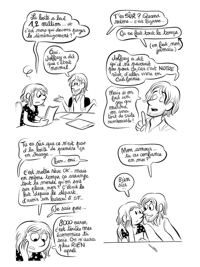 À ce que je sache (mais je ne suis pas de très près donc je peux me tromper), tu es encore en Calif, encore à fond dans l'aventure Greedy Grub, or à différents passages de cette BD (le fait que tu n'aies aucune part, maintenant l'histoire du remboursement), on dirait que tu t'es faite "avoir" et que tu le regrettes... alors que t'es toujours dedans, tu vois ce que je veux dire ? Alors je pense soit tu vas annoncer (ou tu l'as ptêtr déjà annoncé) que Greedy Grub est de l'histoire ancienne, soit tu es encore dedans après avoir réussi à rediscuter de tout ca avec les protagonistes, qui ont accepté que tu relates ton expérience. Si c'est la deuxième solution ce serait très très fort sur le plan psychologique...