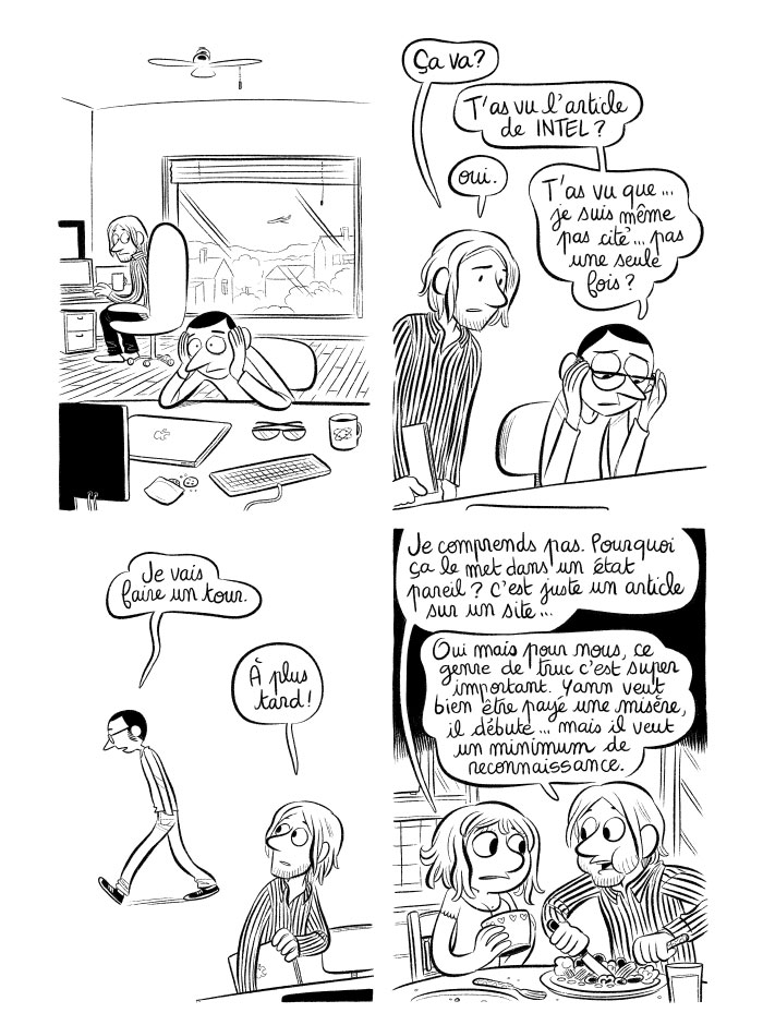 12 ans que je travaille dans le secteur du jeu vidéo en tant que développeur C++. Avec notre expérience, oui, cette reconnaissance, on s'en passe. On sait ce que l'on vaut, les points que l'on doit améliorer, etc. Par contre, pour un débutant, qui cherche sa place, se questionne constamment sur sa légitimité, ne compte pas ses heures, forcément c'est infiniment plus dur à avaler. Lorsque tu es jeune, le sentiment de justice est aussi beaucoup plus prononcé. Bref, tout ça pour dire que mon ancien moi (oui on est plusieurs dans ma tête, ça aide à rester créatif au moins) comprend très bien la détresse "fictionnelle" (ou pas) de Yann. @Laurel, merci beaucoup pour cette BD ! Je trépigne d'impatience chaque jour pour connaitre la suite.