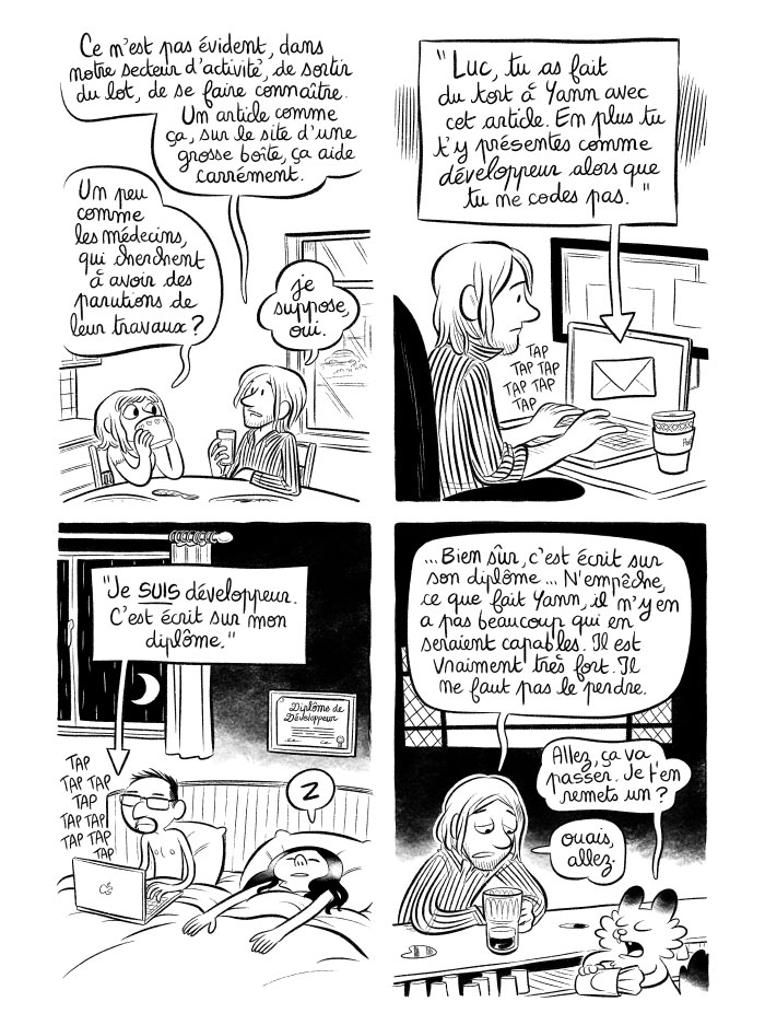 A ce stade de la BD, j'avoue que je ne comprends toujours pas ce que vous faites à San Francisco si vous passez vos journées à bosser sur l'ordi. L'inverse n'aurait-il pas été plus logique ? La partie gérée par Luc à SF et le codage et graphisme dans des bureaux parisiens ?